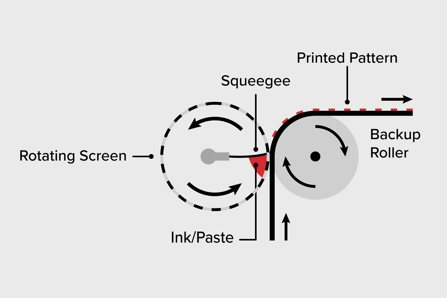 The Rotary screen is for production of large quantities of the same motif onto a rolled-up substrate in a continuous process. It is fast and the evaporation is less pronounced than from the flatbed screen. The technique is not suitable for small tests as it requires more ink to fill the screen and setup/cleaning is more time consuming.