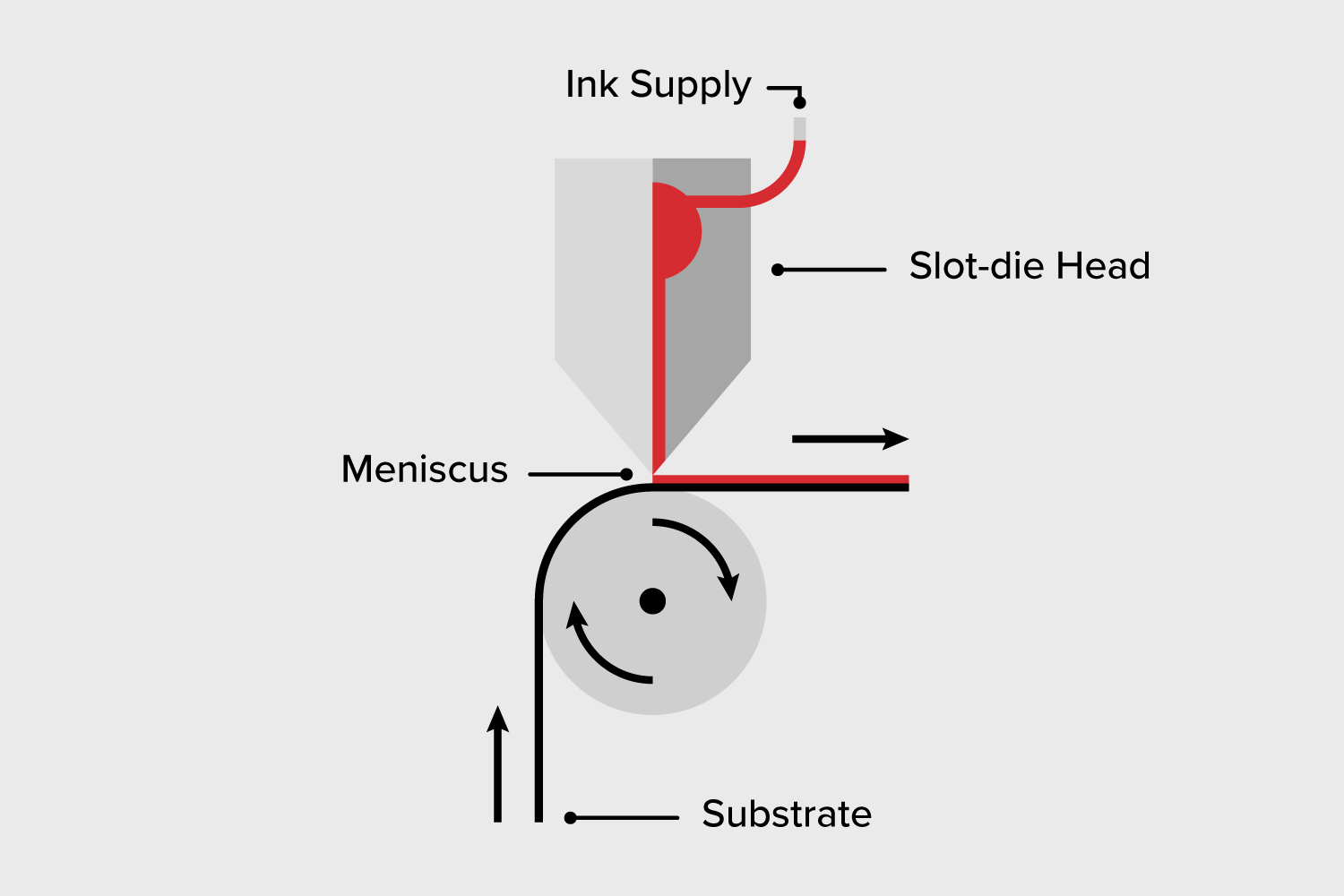 Slot-Die Coating is a non-contact method that deposits the ink through a guiding meniscus followed by drying. The ink flows at a constant rate as the slot-die head or substrate moves, allowing precise thickness control. This method is used for industrial-scale continuous processes, such as roll-to-roll production for large areas. Within processing of solar cells slot-die coating is used for deposition of active layers, hole and electron transport layers and top and bottom electrodes if using conductive inks such as silver nanoparticles or silver nanowires.