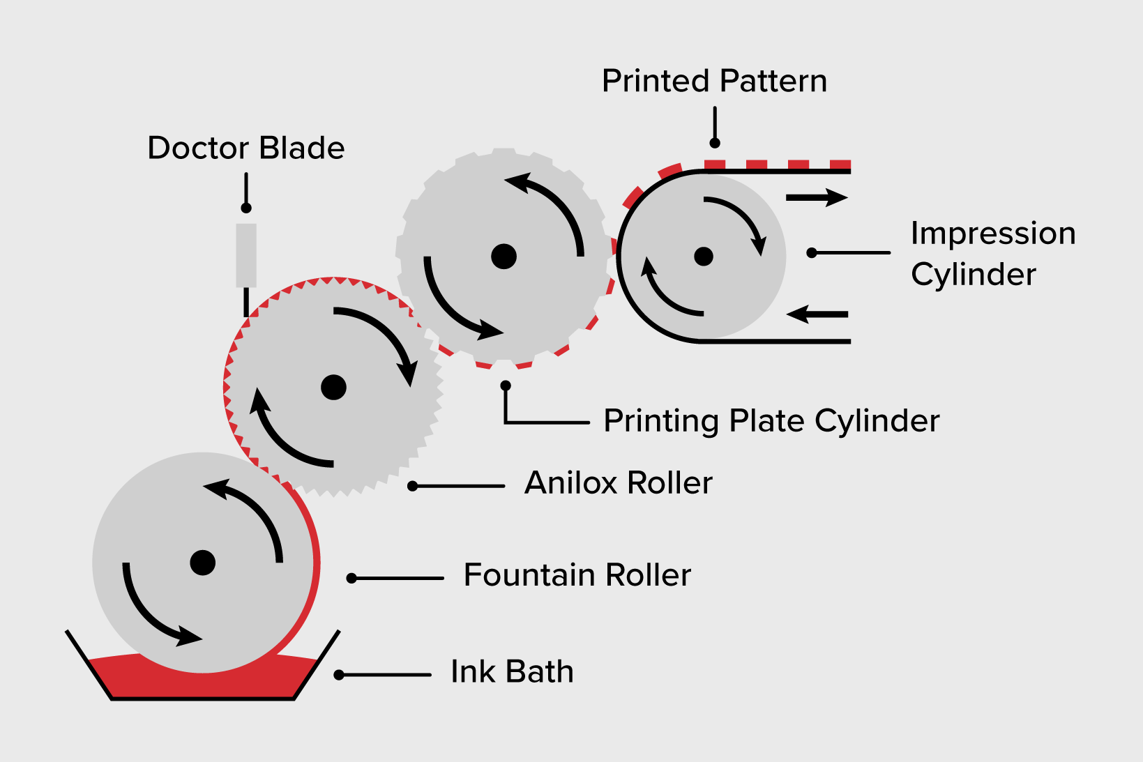 Flexographic Printing consists of a patterned cylinder and contrary to gravure the patterns are not from cavities but from raised reliefs. The patterned reliefs are suitable to transfer the ink via continuous stamping. Ink moves from a reservoir through fountain roller, then transfers the ink to anilox roller which has microcavities, then finally transfers it into printing cylinder to imprint the substrate. In printed solar cells, flexographic printing is typically used for patterned deposition of conductive inks and encapsulation materials, benefiting from its compatibility with flexible substrates.
