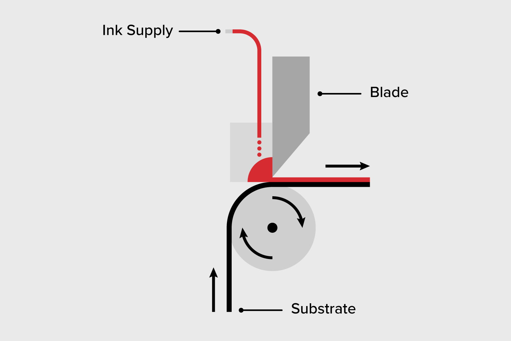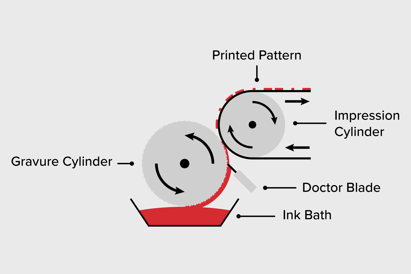 Gravure Printing is traditionally used for high-volume products such as catalogues and packaging. Gravure cylinder transfers the ink onto the substrate via its cavities, which are the patterns carved on the cylinder. Immersed partially in an ink bath, the cylinder carries the ink by filling the cavities on its surface. A doctor blade removes the excess ink from the cylinder surface before the ink is transferred to the substrate through surface interactions. The simple two roller system making it excellent for rapid deposition of uniform thin films, particularly for large-scale coating of transport layers or active layers in roll-to-roll production lines.